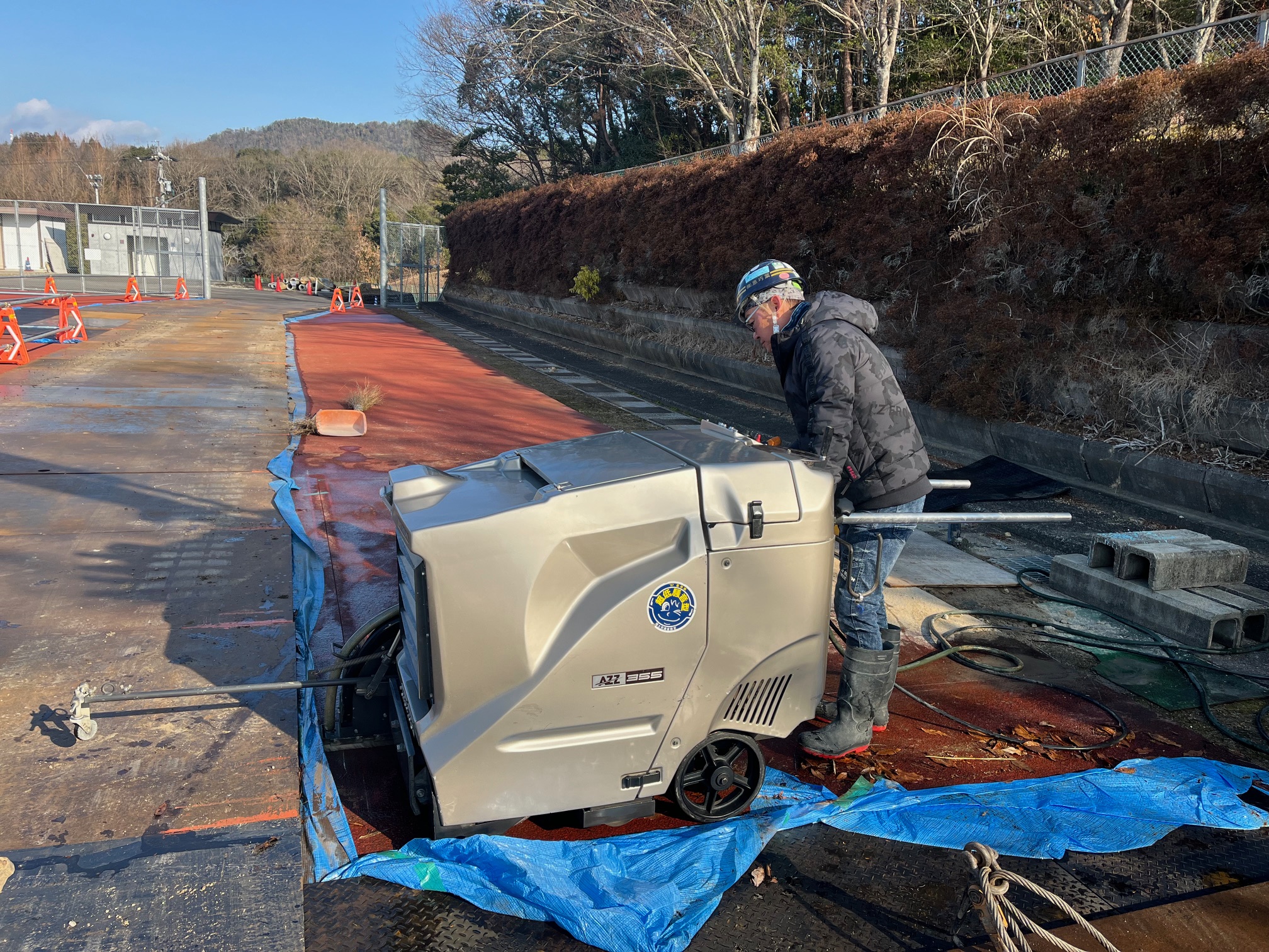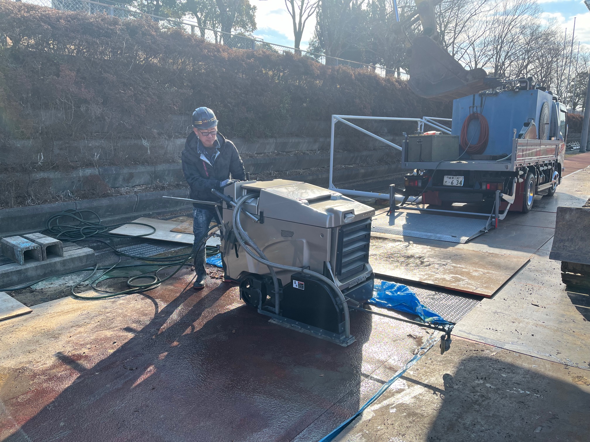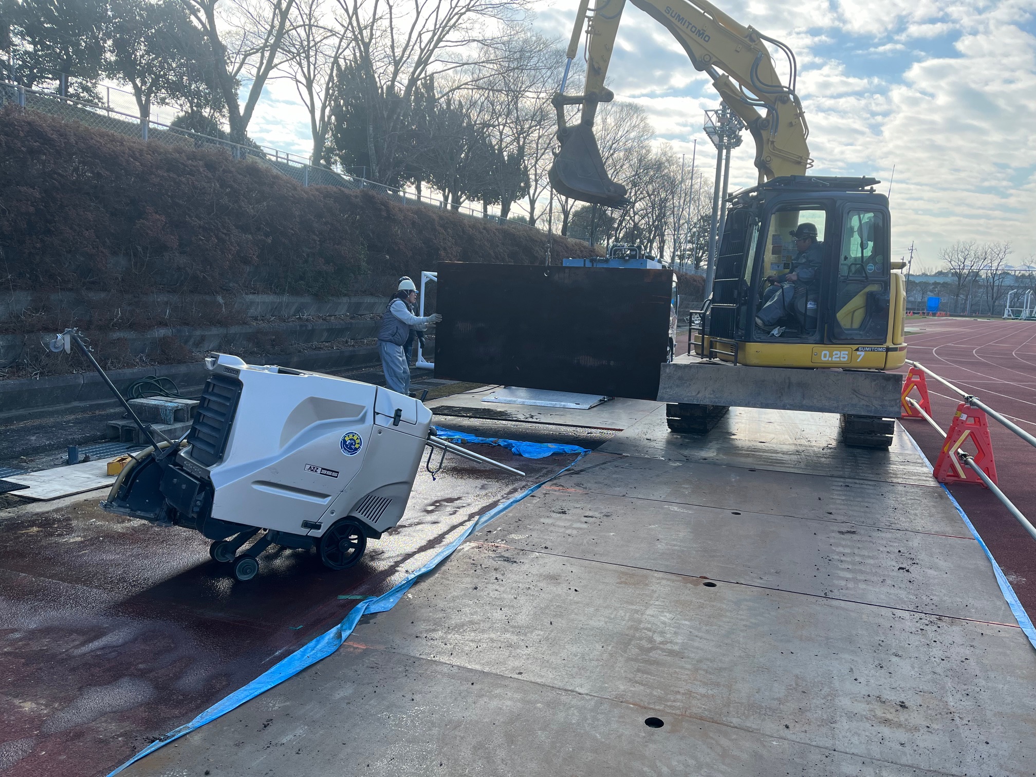 陸上競技場にて照明灯を設置する範囲の2重舗装と表面のゴムで出来たクッション材(タータン)の撤去です。